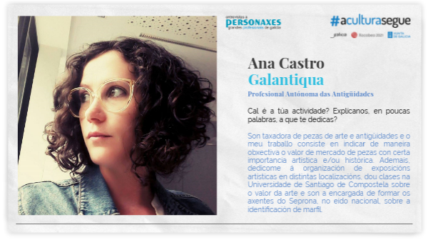 Cal é a túa actividade? Explícanos, en poucas palabras, a que te dedicas? Son taxadora de pezas de arte e antigüidades e o meu traballo consiste en indicar de maneira obxectiva o valor de mercado de pezas con certa importancia artística e/ou histórica. Ademais, dedícome á organización de exposicións artísticas en distintas localizacións, dou clases na Universidade de Santiago de Compostela sobre o valor da arte e son a encargada de formar os axentes do Seprona, no eido nacional, sobre a identificación de marfil.