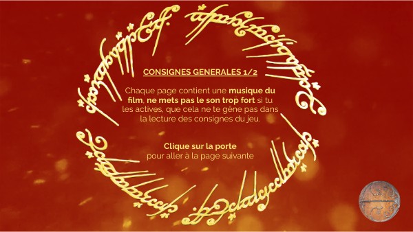 CONSIGNES GENERALES 1/2 Chaque page contient une musique du film, ne mets pas le son trop fort si tu les actives, que cela ne te gêne pas dans la lecture des consignes du jeu. Clique sur la porte pour aller à la page suivante