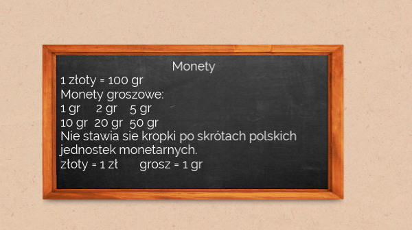 1 złoty = 100 grMonety groszowe: 1 gr 2 gr 5 gr 10 gr 20 gr 50 gr Nie stawia sie kropki po skrótach polskich jednostek monetarnych. złoty = 1 zł grosz = 1 gr