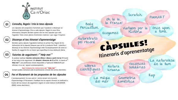 Decideix quina càpsula t’agradaria realitzar en primer lloc, llegeix bé les indicacions de la càpsula (tasques que cal fer o producte final) i planifica i dissenya el teu itinerari d’aprenentatge amb l’acompanyament de tutor/a i familia. Et suggerim fer un horari que especifiqui la teva dedicació diària.