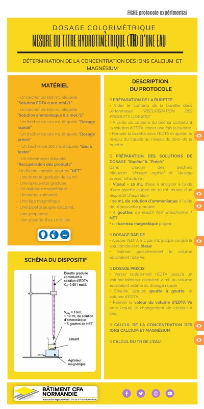 ➽ PRÉPARATION DE LA BURETTE ‣ Vider le contenu de la burette dans l'erlenmeyer "RÉCUPÉRATION DES PRODUITS USAGERS" ‣ À l'aide du contenu du bécher contenant la solution d'EDTA, rincer une fois la burette. ‣ Remplir la burette avec l'EDTA et ajuster le niveau du liquide au niveau du zéro de la burette. ➽ PRÉPARATION DES SOLUTIONS DE DOSAGE "Rapide" & "Précis" Dans chacun des béchers étiquetés "dosage rapide" et "dosage précis", introduire : ‣ V(eau) = 10 mL d'eau à analyser à l'aide d'une pipette jaugée de 10 mL munie d'un dispositif d'aspiration ‣ 10 mL de solution d'ammoniaque à l'aide de l'éprouvette graduée ‣ 5 gouttes de réactif Noir Eriochrome T NET ‣ un barreau magnétique propre ➽ DOSAGE RAPIDE ‣ Ajouter l'EDTA mL par mL jusquà ce que la solution devient bleue ‣ Estimer grossièrement le volume équivalent noté Ve ➽ DOSAGE PRÉCIS ‣ Verser rapidement l'EDTA jusqu'à un volume inférieur d'environ 2 mL au volume équivalent estimé au dosage rapide ‣ Ensuite, ajouter, goutte à goutte, le volume d'EDTA ‣ Relever la valeur du volume d'EDTA Ve pour lequel le changement de couleur a lieu. ➽ CALCUL DE LA CONCENTRATION DES IONS CALCIUM ET MAGNÉSIUM ➽ CALCUL DU TH DE L'EAU