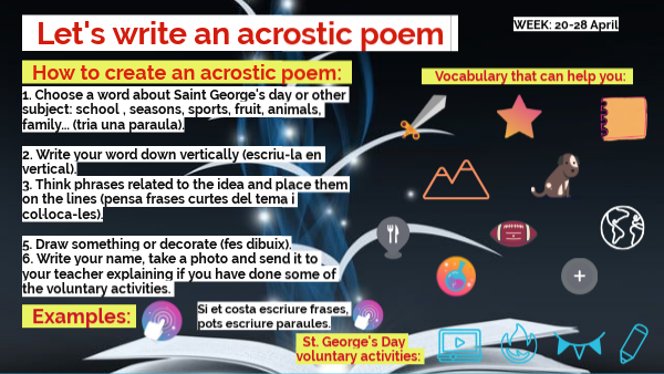 1. Choose a word about Saint George's day or other subject: school , seasons, sports, fruit, animals, family... (tria una paraula). 2. Write your word down vertically (escriu-la en vertical). 3. Think phrases related to the idea and place them on the lines (pensa frases curtes del tema i col·loca-les). 5. Draw something or decorate (fes dibuix). 6. Write your name, take a photo and send it to your teacher explaining if you have done some of the voluntary activities.