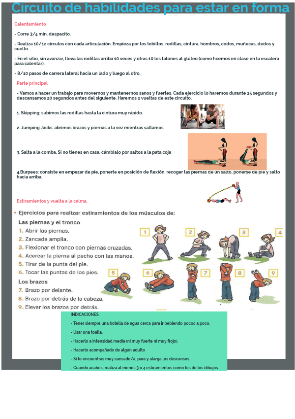 INDICACIONES.- Tener siempre una botella de agua cerca para ir bebiendo pococ a poco. - Usar una toalla. - Hacerlo a intensidad media (ni muy fuerte ni muy flojo). - Hacerlo acompañado de algún adulto - Si te encuentras muy cansado/a, para y alarga los descansos. - Cuando acabes, realiza al menos 3 o 4 estiramientos como los de los dibujos.