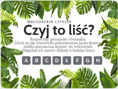 Rozpocznij przygodę z botaniką. Liście są jak wizytówki pozostawione przez drzewa, dzięki nim można dotrzeć do właścicieli. Odgadnij ich nazwy. Kliknij w kolejne litery.