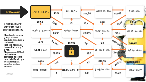 Elige la ruta correcta y llega hasta el candado. Introduce la contraseña. Para ello neesitarás los resultados 2, 4, 6, 7 y 11. El número de CIFRAS decimales se corresponde con la letra del alfabeto que necesitarás para descifrar la clave. ¡Suerte!