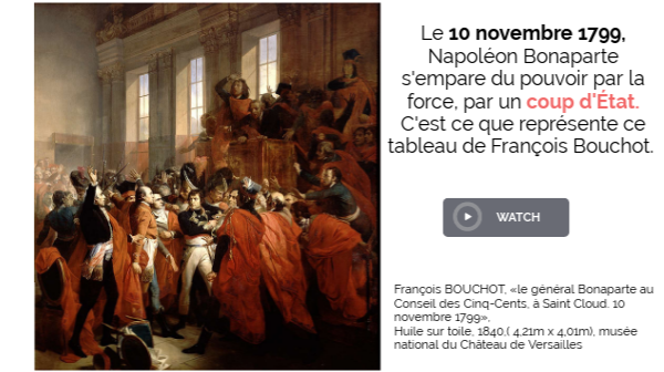 Napoléon Bonaparte porte l’uniforme de général, avec une ceinture aux couleurs de la République, bleu, blanc, rouge. Il est très calme, son visage est blême alors que les députés qui l’entourent crient, lèvent les bras. Le peintre veut montrer par ce contraste que le jeune général (il a 30 ans) semble avoir toutes les qualités pour diriger la France. Juste derrière lui, deux soldats moustachus, portant un bonnet à poil, le protègent de la colère des députés. Ce sont des grenadiers, soldats d'élite de l'armée de Bonaparte qui lui sont entièrement dévoués. Mais au juste qui est ce jeune général et pourquoi est-il très populaire en 1799 ? Regarde cette vidéo pour le savoir ;