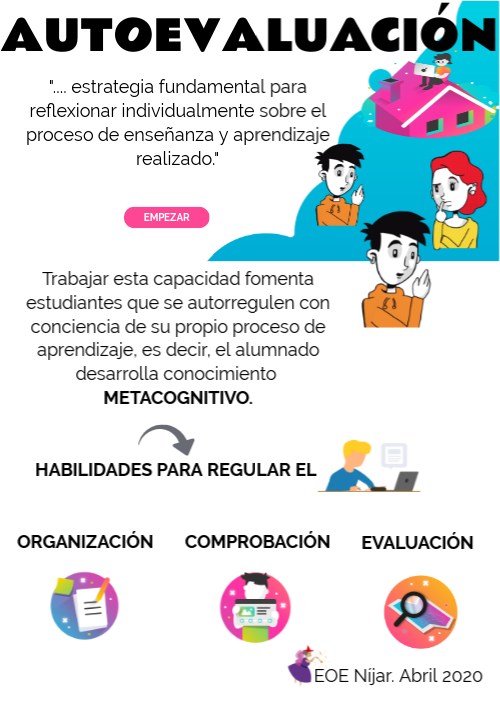 ".... estrategia fundamental para reflexionar individualmente sobre el proceso de enseñanza y aprendizaje realizado." Trabajar esta capacidad fomenta estudiantes que se autorregulen con conciencia de su propio proceso de aprendizaje, es decir, el alumnado desarrolla conocimiento METACOGNITIVO. HABILIDADES PARA REGULAR EL ORGANIZACIÓN COMPROBACIÓN