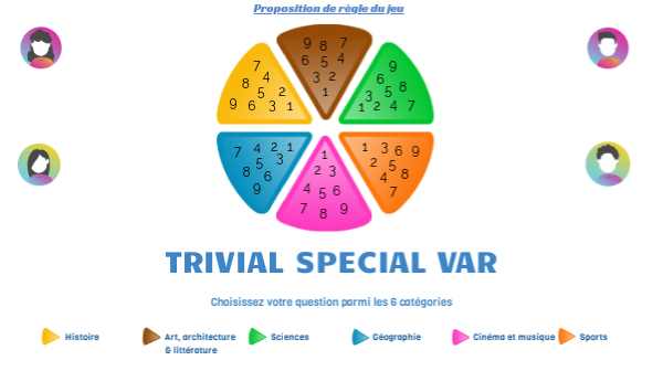 - Sur une feuille, inscrivez le nom des joueurs et les points gagnés au fur et à mesure du jeu.- Inscrivez aussi chaque catégorie et au fur et à mesure le numéro des questions que vous avez déjà utilisées.