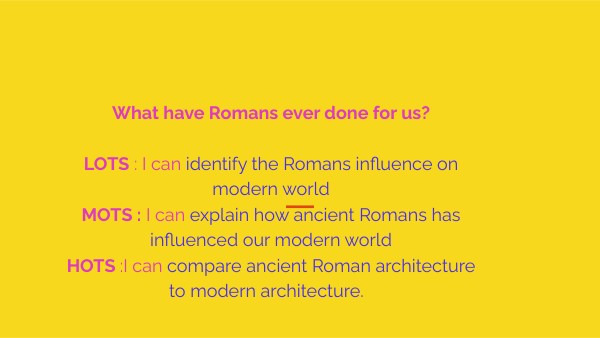 What have Romans ever done for us? LOTS : I can identify the Romans influence on modern world MOTS : I can explain how ancient Romans has influenced our modern world HOTS :I can compare ancient Roman architecture to modern architecture.