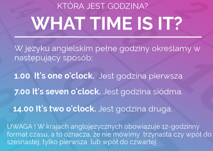 UWAGA ! W krajach anglojęzycznych obowiązuje 12-godzinny format czasu, a to oznacza, że nie mówimy trzynasta czy wpół do szesnastej, tylko pierwsza lub wpół do czwartej.