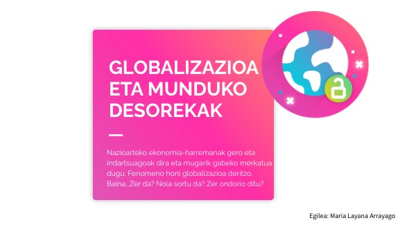 Nazioarteko ekonomia-harremanak gero eta indartsuagoak dira eta mugarik gabeko merkatua dugu. Fenomeno honi globalizazioa deritzo. Baina...Zer da? Nola sortu da? Zer ondorio ditu?
