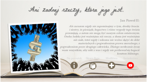 Ale zarazem nigdy nie zapominajmy o tym, drodzy bracia i siostry, że pieniądz, bogactwo i różne wygody tego świata przemijają, a zatem nie mogą być naszym celem ostatecznym. Osoba ludzka jest ważniejsza niż rzeczy, a dusza jest ważniejsza niż ciało, toteż nigdy i nikomu nie wolno dążyć do dóbr materialnych z pogwałceniem prawa moralnego, z pogwałceniem praw drugiego człowieka. Dlatego serdecznie życzę wam wszystkim, aby nikt z was i nigdy nie próbował się bogacić kosztem bliźniego.