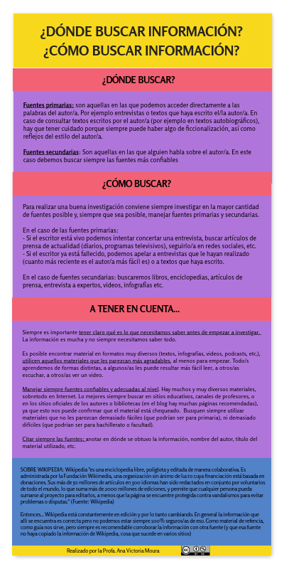 Siempre es importante tener claro qué es lo que necesitamos saber antes de empezar a investigar. La información es mucha y no siempre necesitamos saber todo. Es posible encontrar material en formatos muy diversos (textos, infografías, videos, podcasts, etc.), utilicen aquellos materiales que les parezcan más agradables, al menos para empezar. Todo/s aprendemos de formas distintas, a algunos/as les puede resultar más fácil leer, a otros/as escuchar, a otros/as ver un video. Manejar siempre fuentes confiables y adecuadas al nivel. Hay muchos y muy diversos materiales, sobretodo en Internet. Lo mejores siempre buscar en sitios educativos, canales de profesores, o en los sitios oficiales de los autores o bibliotecas (en el blog hay muchas páginas recomendadas), ya que esto nos puede confirmar que el material está chequeado. Busquen siempre utilizar materiales que no les parezcan demasiado fáciles (que podrían ser para primaria), ni demasiado difíciles (que podrían ser para bachillerato o facultad). Citar siempre las fuentes: anotar en dónde se obtuvo la información, nombre del autor, título del material utilizado, etc.