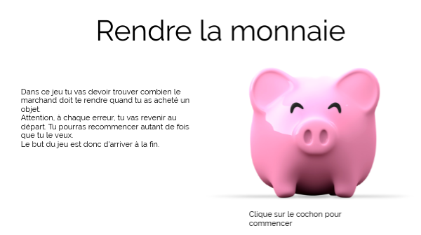 Dans ce jeu tu vas devoir trouver combien le marchand doit te rendre quand tu as acheté un objet. Attention, à chaque erreur, tu vas revenir au départ. Tu pourras recommencer autant de fois que tu le veux. Le but du jeu est donc d'arriver à la fin.