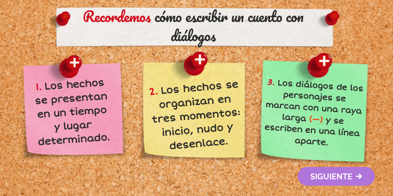 La parte resaltada de color rojo corresponde al NUDO de la historia, aquí presentamos los diálogos que tienen los personajes. Ojo: Se escribe en una línea a parte y con una raya adelante.