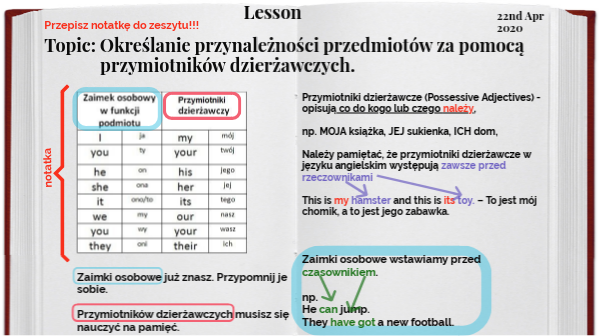 Topic: Określanie przynależności przedmiotów za pomocą przymiotników dzierżawczych.