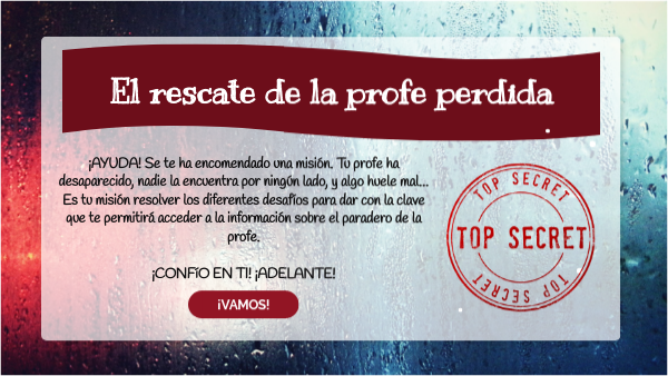 ¡AYUDA! Se te ha encomendado una misión. Tu profe ha desaparecido, nadie la encuentra por ningún lado, y algo huele mal...Es tu misión resolver los diferentes desafíos para dar con la clave que te permitirá acceder a la información sobre el paradero de la profe. ¡CONFíO EN TI! ¡ADELANTE!