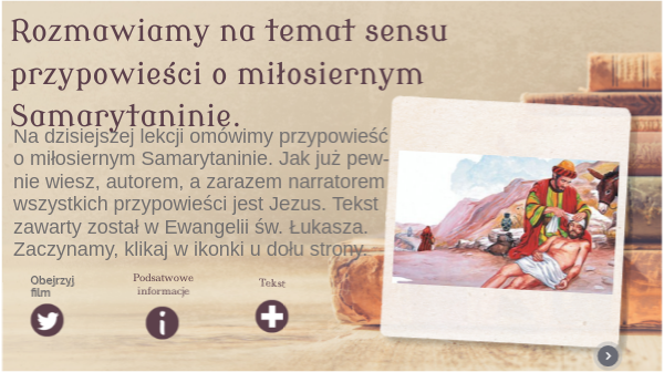 Na dzisiejszej lekcji omówimy przypowieść o miłosiernym Samarytaninie. Jak już pew-nie wiesz, autorem, a zarazem narratorem wszystkich przypowieści jest Jezus. Tekst zawarty został w Ewangelii św. Łukasza. Zaczynamy, klikaj w ikonki u dołu strony.