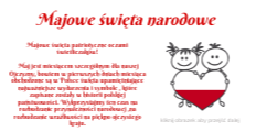 Majowe święta patriotyczne oczami świetliczaków! Maj jest miesiącem szczególnym dla naszej Ojczyzny, bowiem w pierwszych dniach miesiąca obchodzone są w Polsce święta upamiętniające najważniejsze wydarzenia i symbole , które zapisane zostały w historii polskiej państwowości. Wykorzystajmy ten czas na rozbudzanie przynależności narodowej ,na rozbudzanie wrażliwości na piękno ojczystego kraju.