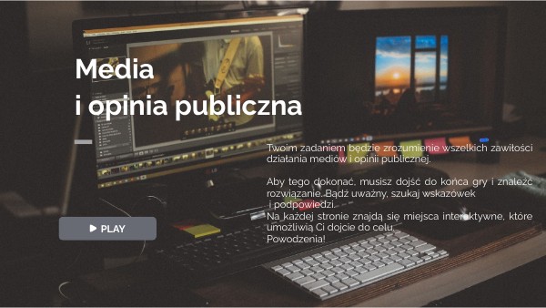 Twoim zadaniem będzie zrozumienie wszelkich zawiłości działania mediów i opinii publicznej. Aby tego dokonać, musisz dojść do końca gry i znaleźć rozwiązanie. Bądź uważny, szukaj wskazówek i podpowiedzi. Na każdej stronie znajdą się miejsca interaktywne, które umożliwią Ci dojcie do celu. Powodzenia!