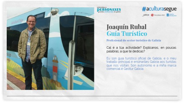 Cal é a túa actividade? Explícanos, en poucas palabras, a que te dedicas? Eu son guía turístico oficial de Galicia, e o meu traballo principal é ensinarlles Galicia aos turistas que nos visitan. Son autónomo e a miña marca comercial é Geotur Galicia.