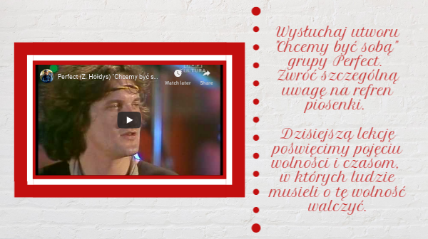 Wysłuchaj utworu "Chcemy być sobą" grupy Perfect. Zwróć szczególną uwagę na refren piosenki. Dzisiejszą lekcję poświęcimy pojęciu wolności i czasom, w których ludzie musieli o tę wolność walczyć.