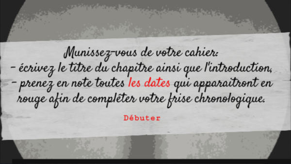 Munissez-vous de votre cahier: - écrivez le titre du chapitre ainsi que l'introduction, - prenez en note toutes les dates qui apparaitront en rouge afin de compléter votre frise chronologique.