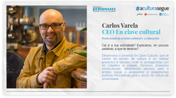 Cal é a túa actividade? Explícanos, en poucas palabras, a que te dedicas? Desenvolvo o proxecto En Clave Cultural, que se centra na xestión da cultura e en realizar proxectos e servizos onde os protagonistas son os cidadáns e cidadás. Facemos proxectos socioculturais, deseñamos servizos para o ámbito social e analizamos e propoñemos políticas innovadoras para o sector da cultura de proximidade.