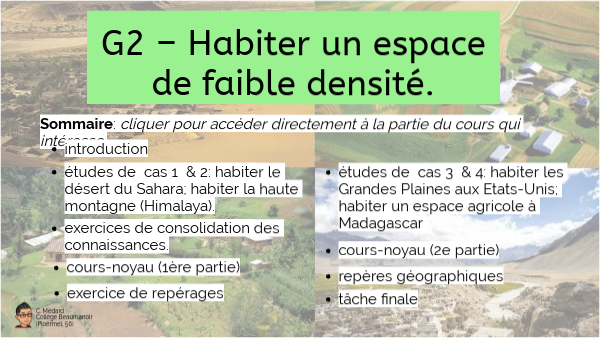 > Habiter les Grandes Plaines aux Etats-Unis (p.222 à 225 du manuel numérique ) ; > Habiter un espace agricole faiblement peuplé à Madagascar (p. 226-227 )
