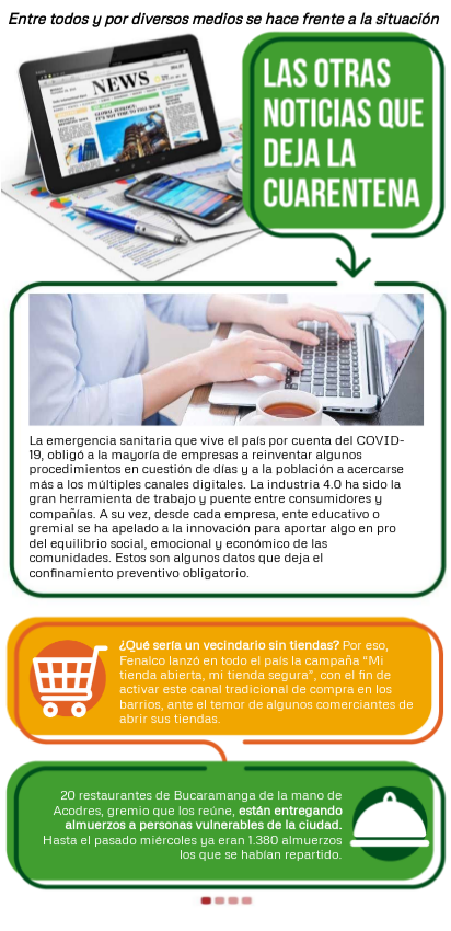 La emergencia sanitaria que vive el país por cuenta del COVID-19, obligó a la mayoría de empresas a reinventar algunos procedimientos en cuestión de días y a la población a acercarse más a los múltiples canales digitales. La industria 4.0 ha sido la gran herramienta de trabajo y puente entre consumidores y compañías. A su vez, desde cada empresa, ente educativo o gremial se ha apelado a la innovación para aportar algo en pro del equilibrio social, emocional y económico de las comunidades. Estos son algunos datos que deja el confinamiento preventivo obligatorio.