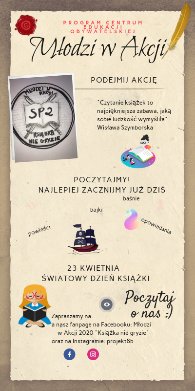 Zapraszamy na: a nasz fanpage na Facebooku: Młodzi w Akcji 2020 "Książka nie gryzie" oraz na Instagramie: projekt8b