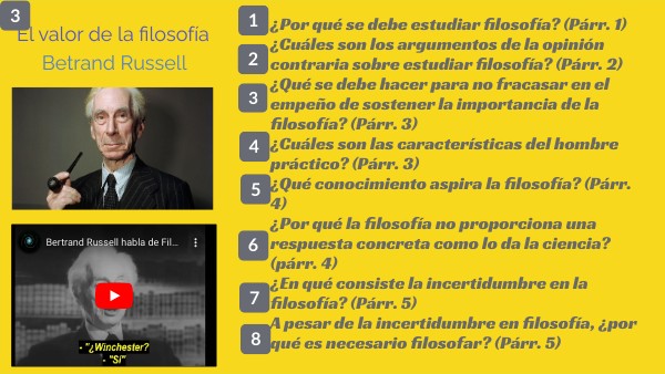¿Por qué se debe estudiar filosofía? (Párr. 1) ¿Cuáles son los argumentos de la opinión contraria sobre estudiar filosofía? (Párr. 2) ¿Qué se debe hacer para no fracasar en el empeño de sostener la importancia de la filosofía? (Párr. 3) ¿Cuáles son las características del hombre práctico? (Párr. 3) ¿Qué conocimiento aspira la filosofía? (Párr. 4) ¿Por qué la filosofía no proporciona una respuesta concreta como lo da la ciencia? (párr. 4) ¿En qué consiste la incertidumbre en la filosofía? (Párr. 5) A pesar de la incertidumbre en filosofía, ¿por qué es necesario filosofar? (Párr. 5)