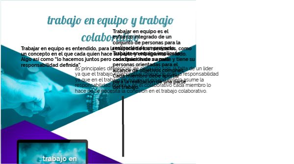as principales diferencias de cada uno son: la falta de un lider ya que el trabajo colaborativo carece de este.la responsabilidad ya que en el trabajo en equipo el equipo entero asume la responsabilidad entera y en el colaborativo cada miembro lo hace no se necesita la cohesion en el trabajo colaborativo.