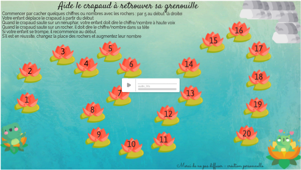 Commencer par cacher quelques chiffres ou nombres avec les rochers : par 5 au début (à droite) Votre enfant déplace le crapaud à partir du début Quand le crapaud saute sur un nénuphar, votre enfant doit dire le chiffre/nombre à haute voix Quand le crapaud saute sur un rocher, il doit dire le chiffre/nombre dans sa tête Si votre enfant se trompe, il recommence au début. S'il est en réussite, changez la place des rochers et augmentez leur nombre
