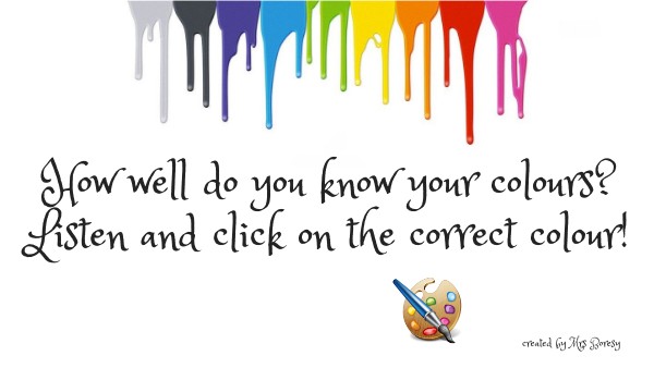 Students learn the English words for colours. They have to listen and click on the right colour. Enjoy!
