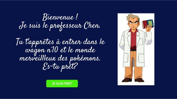 Bienvenue !Je suis le professeur Chen. Tu t'apprêtes à entrer dans le wagon n°10 et le monde merveillleux des pokémons. Es-tu prêt?