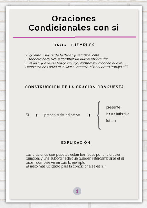 Las oraciones compuestas están formadas por una oración principal y una subordinada que pueden intercambiarse el el orden como se ve en cuarto ejemplo. El nexo más utilizado para la condicionales es “si“.