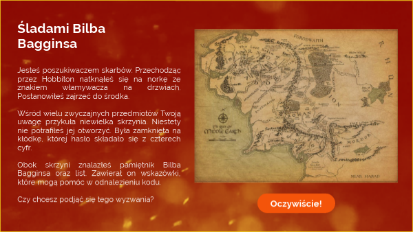 Jesteś poszukiwaczem skarbów. Przechodząc przez Hobbiton natknąłeś się na norkę ze znakiem włamywacza na drzwiach. Postanowiłeś zajrzeć do środka. Wśród wielu zwyczajnych przedmiotów Twoją uwagę przykuła niewielka skrzynia. Niestety nie potrafiłeś jej otworzyć. Była zamknięta na kłódkę, której hasło składało się z czterech cyfr. Obok skrzyni znalazłeś pamiętnik Bilba Bagginsa oraz list. Zawierał on wskazówki, które mogą pomóc w odnalezieniu kodu. Czy chcesz podjąć się tego wyzwania?