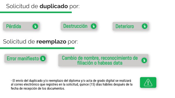 - El envío del duplicado y/o reemplazo del diploma y/o acta de grado se realizará al correo electrónico que registres en la solicitud, quince (15) días hábiles después de la fecha de recepción de los documentos..