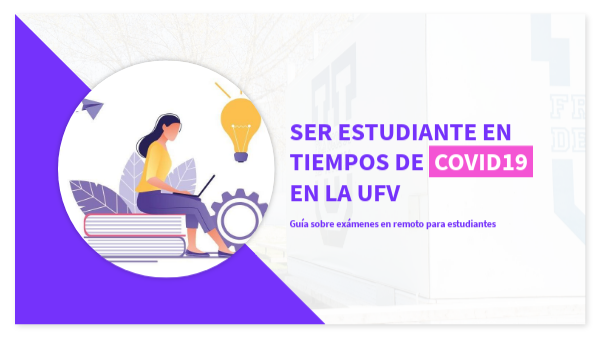 Querido/a alumno/a: Lo sabemos, ser estudiante universitario en “tiempos del Coronavirus” será algo que recordaremos siempre por diferentes motivos. En lo que afecta a tu vida de alumno, lo recordarás por cómo nos tuvimos que recluir en casa, por cómo tuvimos que continuar las clases en remoto, por el esfuerzo que todo esto supuso para todos... Pero esperamos que también lo recuerdes como aquel momento en el que te reinventaste para poder estar siempre conectado con tus compañeros y profesores y por cómo no perdiste de vista el objetivo con el que empezaste el curso: aprender todo lo necesario para poder pasar al curso siguiente y conseguirlo al ritmo que se había marcado. Se acercan los exámenes y sabemos que son fechas importantes para ti. Todos los exámenes serán en remoto a través del Aula Virtual y queremos informarte de aspectos importantes sobre cómo se van a realizar, recursos, fechas, etc. De manera general, el calendario de exámenes previsto para la convocatoria ordinaria se mantiene. Hay algunas excepciones que ya os han anunciado. En algunas titulaciones , por ejemplo, han utilizado una semana extra para su realización o han cambiado la fecha inicialmente programada. Los profesores son muy conscientes de las actuales circunstancias, por lo que la modalidad de examen en remoto planteada en cada caso tendrá siempre en cuenta las exigencias pedagógicas y tecnológicas pertinentes, atendiendo a las posibles particularidades de cada Grado/Máster y de cada asignatura y, también, de las tuyas. Los profesores, al igual que vosotros, están haciendo un gran esfuerzo para que todo salga como está previsto. Ellos te explicarán en qué consisten las pruebas de cada asignatura y te informarán con la suficiente antelación respecto a: horario, tiempo de realización, modalidad de examen, metodología, criterios de evaluación, requisitos tecnológicos, ensayos programados, material técnico requerido y alternativas ante imprevistos. Recuerda que siempre puedes contactar con ellos y con tu profesor encargado de curso. Todo esto es nuevo para todos, pero estamos muy orgullosos de poder contar contigo para que juntos podamos seguir siendo la UFV de siempre. Sabemos que en esta situación excepcional tendrás algunas dudas e inquietudes, por lo que en esta guía te ofrecemos información que esperamos sea de utilidad para despejar la mayoría de ellas y puedas dedicarte a lo que más importa ahora. ¡Prepararte para los exámenes!