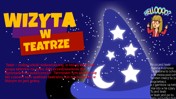 Po co jest teatr Joanna Kulmowa Ta drabina to schody do nieba, a ta miska pod schodami to księżyc. Tamten miecz to zwyczajny pogrzebacz, a z garnków są hełmy rycerzy. Ale kto w te czary nie uwierzy? To jest teatr. A teatr jest po to, żeby wszystko było inne niż dotąd żeby iść do domu w zmyśleniu, w zachwycie. I już zawsze w misce księżyc widzieć...