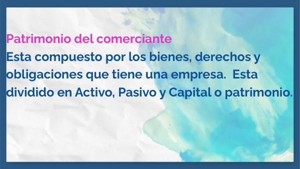 Patrimonio del comercianteEsta compuesto por los bienes, derechos y obligaciones que tiene una empresa. Esta dividido en Activo, Pasivo y Capital o patrimonio.