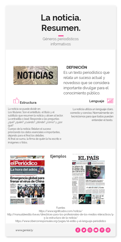 Fuenteshttps://www.significados.com/noticia/ http://manualdeestilo.rtve.es/directrices-para-los-profesionales-de-los-medios-interactivos/4-5-la-estructura-de-la-noticia/ https://www.cibercorresponsales.org/pages/el-estilo-y-el-lenguaje-periodistico