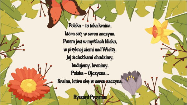 Polska - to taka kraina, która się w sercu zaczyna. Potem jest w myślach blisko, w pięknej ziemi nad Wisłą. Jej ścieżkami chodzimy, budujemy, bronimy. Polska - Ojczyzna... Kraina, która się w sercu zaczyna. Ryszard Przymus