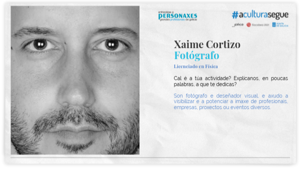 Existe xerga en galego específica e apropiada para o teu sector? Non existe demasiada linguaxe específica para a fotografía e a comunicación visual en xeral. Estamos nun momento de incerteza no que #ACulturaSegue. Pensas que poderemos saír reforzados desta crise sanitaria? Si que penso que poderemos saír reforzados e con novos folgos tras estes momentos complexos.