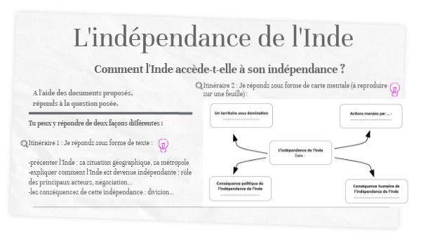 Tu peux y répondre de deux façons différentes : Itinéraire 1 : Je réponds sous forme de texte :-présenter l’Inde : sa situation géographique, sa métropole-expliquer comment l’Inde est devenue indépendante : rôle des principaux acteurs, négociation…-les conséquences de cette indépendance : division…