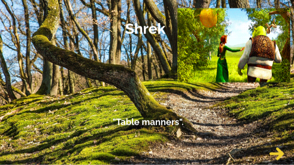 - They are eating vegetables. - The king is annoyed . - Shrek doesn’t know how to behave at the table. - Fiona is angry with Shrek. - Donkey gets the bowl of soup when he sits down. - The queen asks where Shrek and Fiona are going to live. - Donkey makes jokes about Shrek’s place of living. - The queen calls the king “Darling” . - Shrek feels embarrassed with Donkey. - Shrek is surprised with the queen’s question about children. - The king is happy to have ogres for grandchildren.