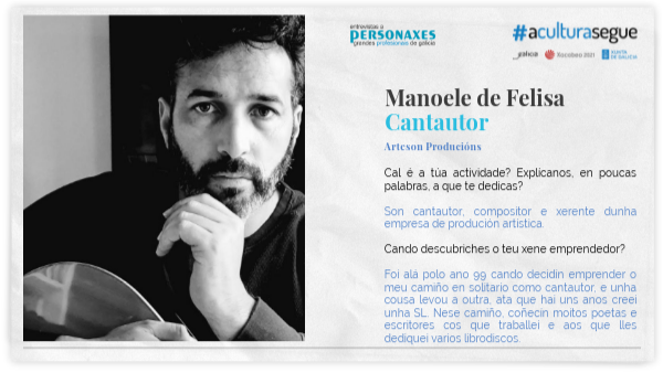 Como axudou o galego a desenvolver a túa empresa? Inicialmente, o galego foi a razón de ser da miña empresa, e segue a ser a razón da miña faceta como cantautor como Manoele de Felisa ou como compoñente da Roda. De non amar a miña lingua e crer no seu potencial, probablemente non seguiría nisto. Como pensas que che podería axudar a crecer? Potenciando o consumo e o uso do galego na sociedade.