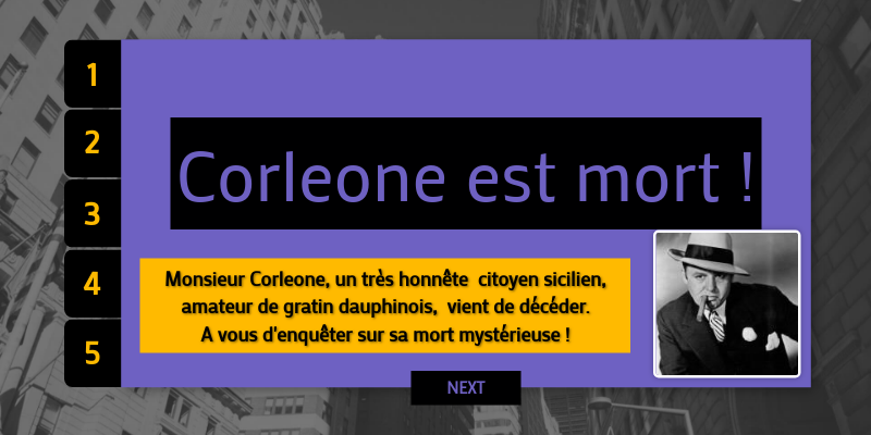 Monsieur Corleone, un très honnête citoyen sicilien, amateur de gratin dauphinois, vient de décéder. A vous d'enquêter sur sa mort mystérieuse !