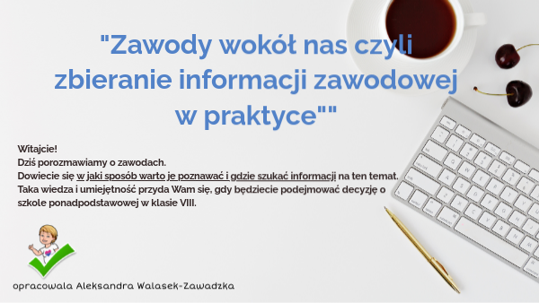 Witajcie!Dziś porozmawiamy o zawodach. Dowiecie się w jaki sposób warto je poznawać i gdzie szukać informacji na ten temat. Taka wiedza i umiejętność przyda Wam się, gdy będziecie podejmować decyzję o szkole ponadpodstawowej w klasie VIII.